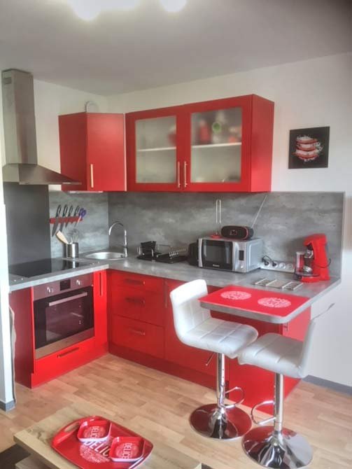 Plaque cuisson 3 feux, Micro-onde, réfrigérateur 100 l avec bac congélation, Senseo, bouilloire, cuit vapeur, hotte aspirante….