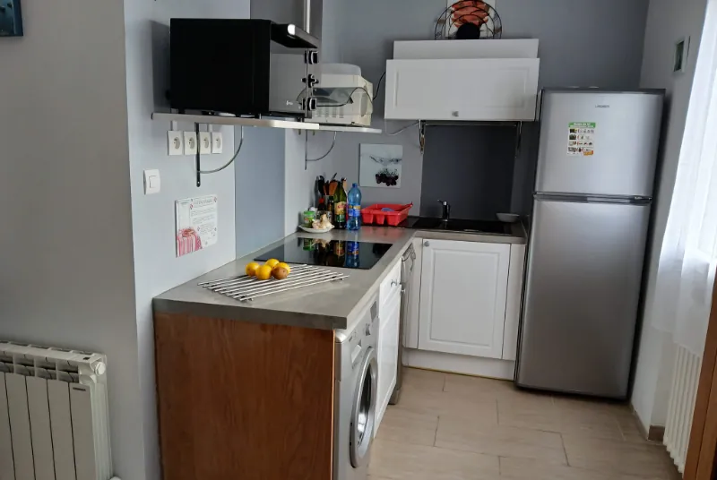 Lave-vaisselle, lave linge, four, micro ondes, plaque vitrocéramique, grand réfrigérateur-congélateur, hotte aspirante, cafetière, grille-pain, bouilloire, table + 4 chaises …