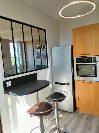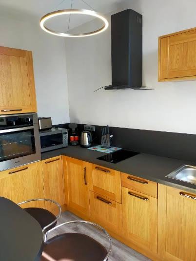 Cuisine équipée, plaque vitrocéramique 2 feux, four électrique, micro-ondes, réfrigérateur, congélateur, ustensiles de cuisine …