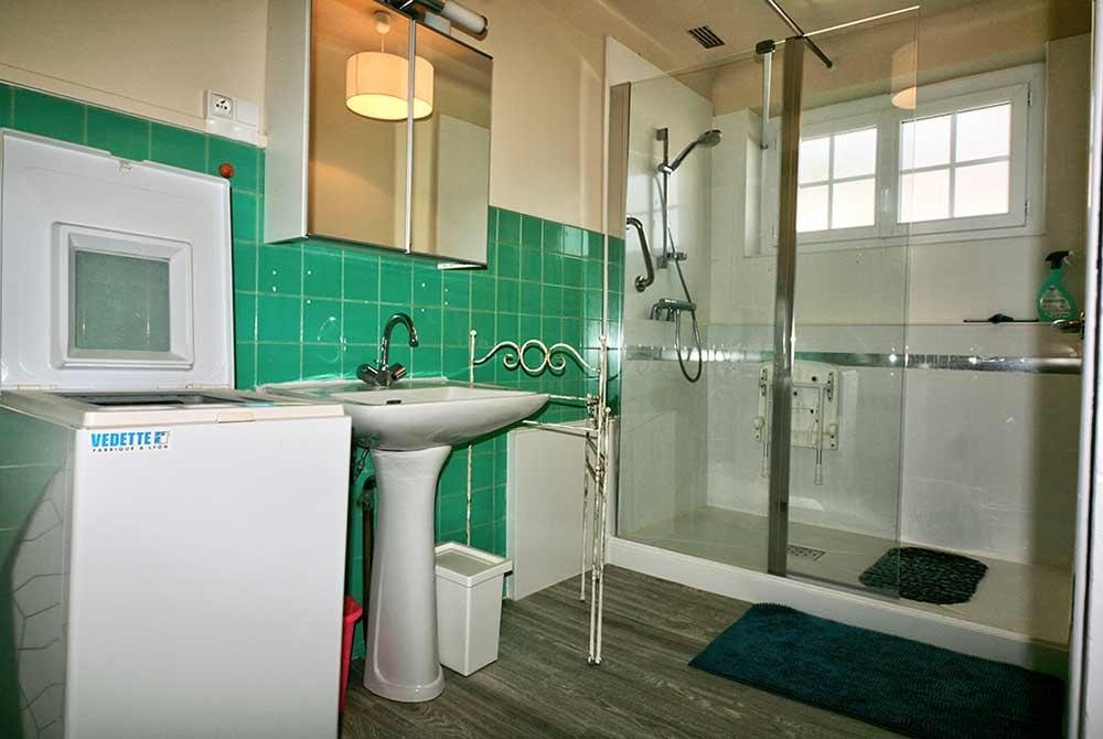 Douche à l’italienne, lave linge, meuble, lavabo.