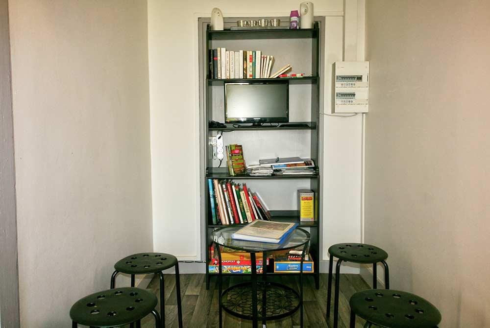 Tabourets, table, bibliothèque, livres, TV …