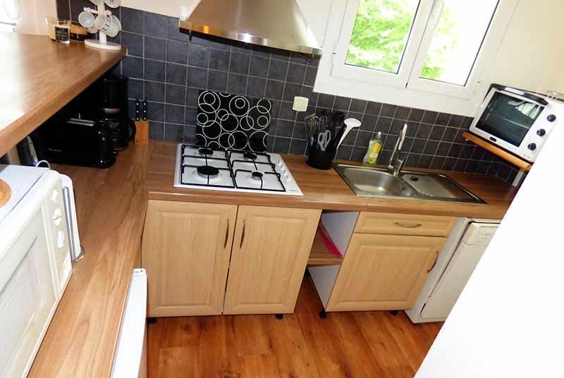 Lave-vaisselle, Lave linge, réfrigérateur, micro-onde four, plaque 3 feux gaz de ville, four, hotte aspirante, vaisselle, cafetière, grille-pain …