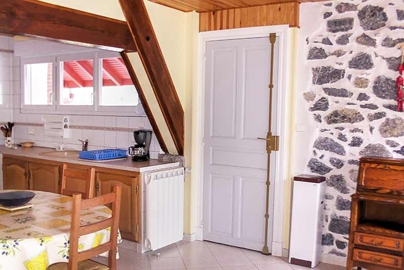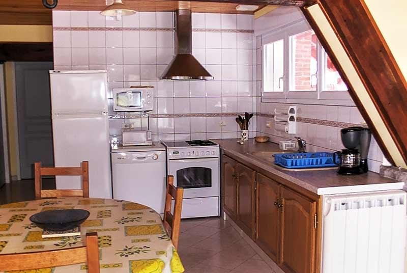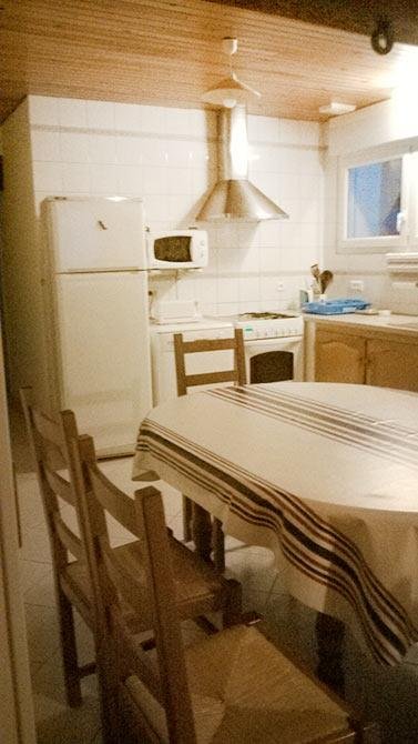 Table, 8 chaise, couverts pour 8 personnes, plats divers, 1 plan de travail moderne avec éléments bas (équipement casseroles, poêles, couverts), cuisinière mixte gaz et électrique avec four électrique,four électrique micro-ondes, lave-vaisselle 12 couverts, produits lessiviels fournis, réfrigérateur 2 portes avec congélateur, 2 placards de rangement (aspirateur, balai, planche et fer à repasser) …