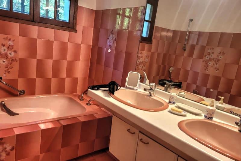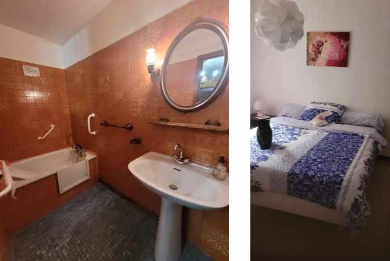 Baignoire, vasque, bidet, placard, sèche cheveux, savon et gel douche fournis.